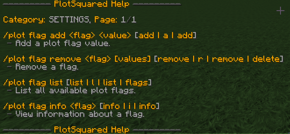 For the full list of flags and their explanations, check out the [PlotSquared wiki](https://intellectualsites.gitbook.io/plotsquared/features/plot-flags).